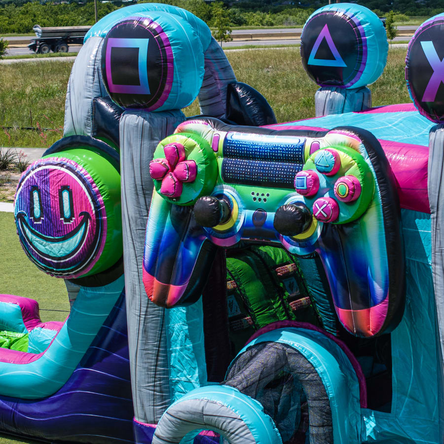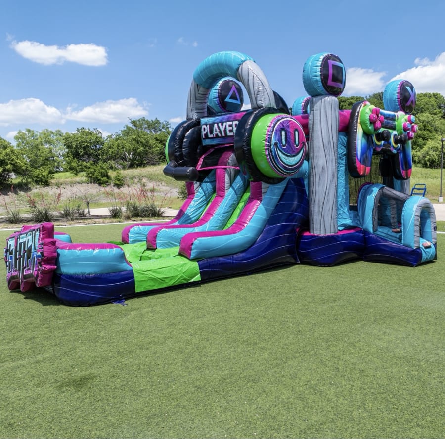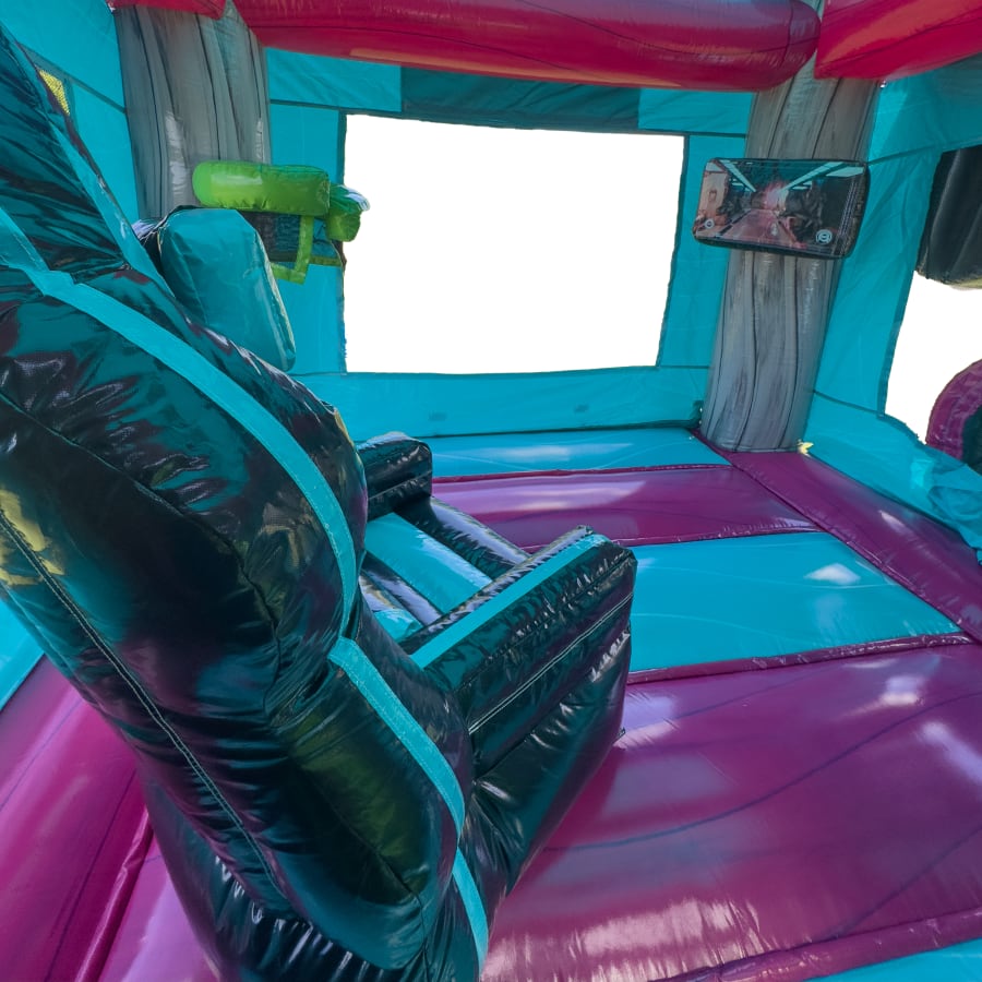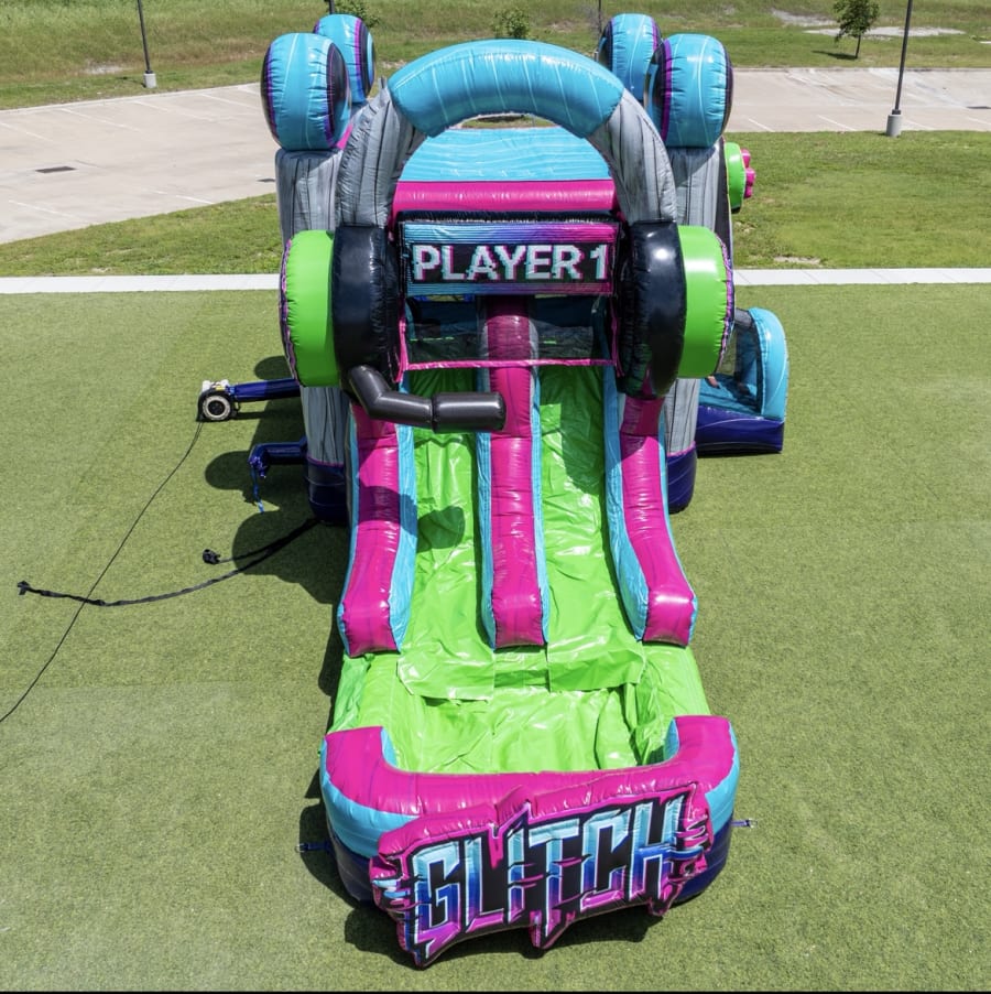 The Glitch Gamer Double Lane Wet/Dry Combo isn’t just another inflatable – it’s a game-changer! Step inside a world where fun and gaming collide. This innovative unit features a real gamer chair and a TV screen inside the spacious bounce house area, offering a true-to-life gaming experience like never before. Kids and adults alike will love jumping, sliding, and competing in a safe, interactive environment.