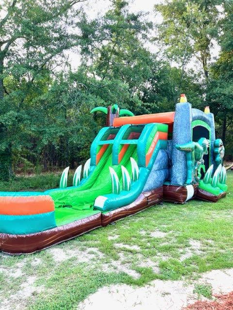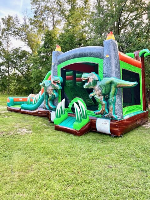 Our Dino Double Lane Combo is DINO-MITE! This is a must have for your dinosaur themed party! Inside you will find TWO basketball hoops, also it has two lanes on the slide for double the fun. It can be used WET and the rider will land in a pool of water or it can be used DRY and the pool is replaced with a bumper to stop the rider safely. This combo is perfect for all ages; toddlers to teenagers!
