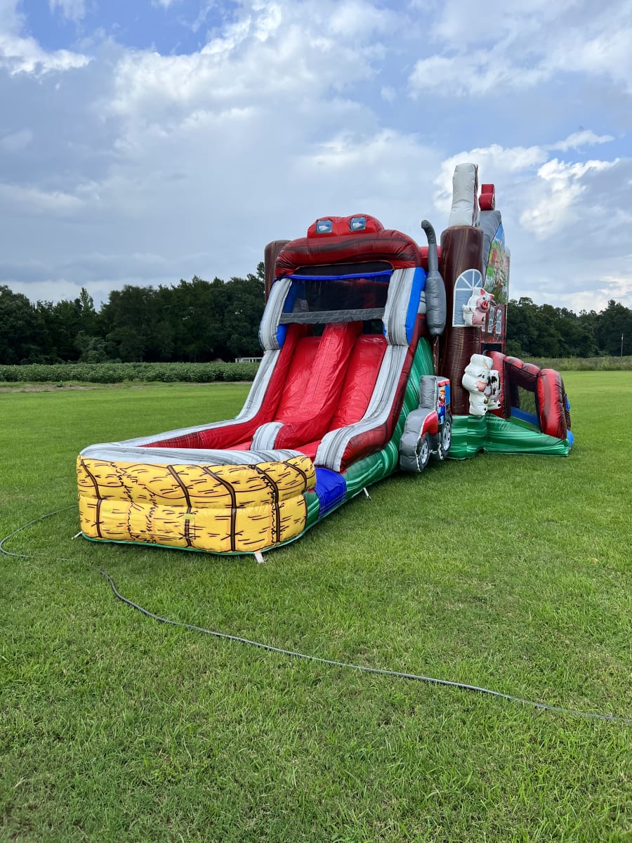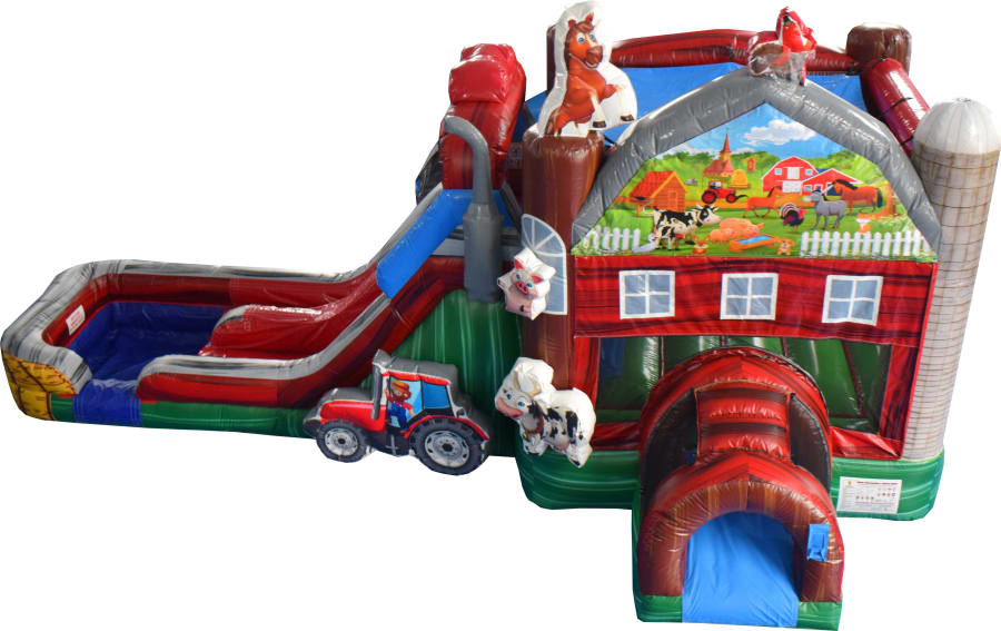 The barnyard combo would be the perfect addition to your farm themed party. It's perfect for the animal lover, with all the farm animals it will surely be a hit! It has double lanes for the slide and a pool landing at the bottom. It also has a basketball hoop inside the jumper. This unit can be used WET OR DRY.
