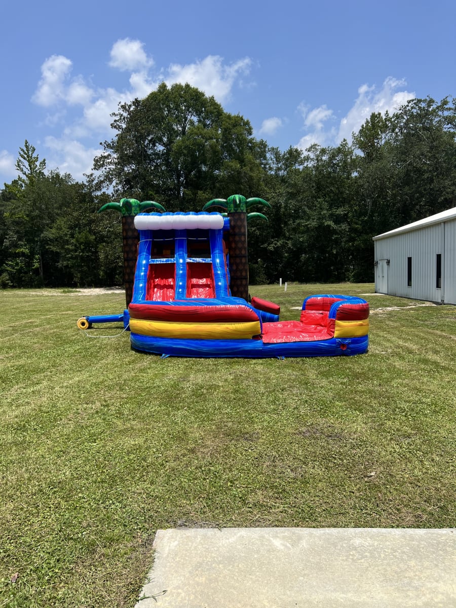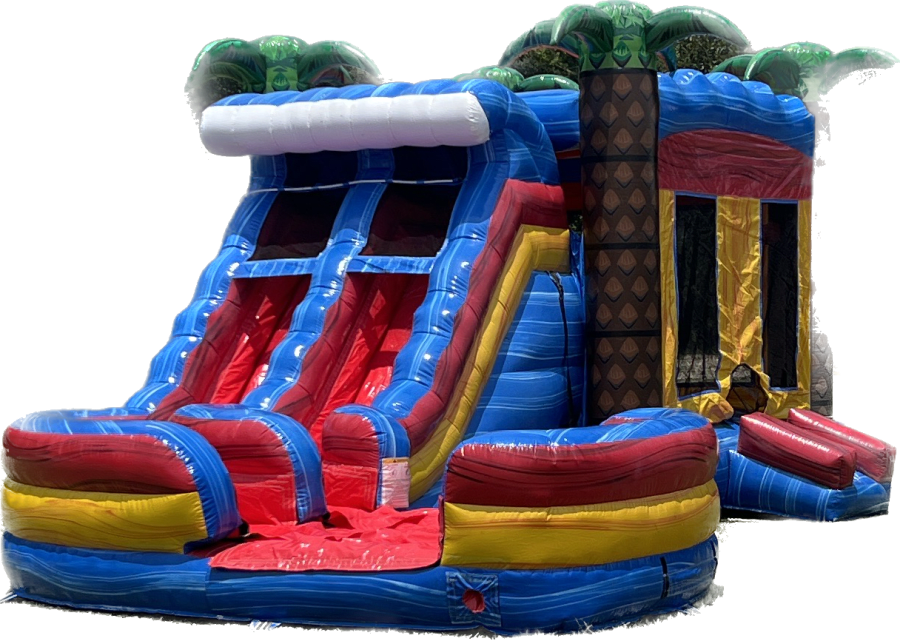 Our BRAND NEW Rip Curl Curved Double Lane Combo is the best bounce house/water slide combo option available. It offers two basketball hoops inside, a dual ladder wall, two lanes to slide for multiple riders, all with a pool landing. It is sure to be a hit! Its suitable for all ages and can be used WET or DRY.