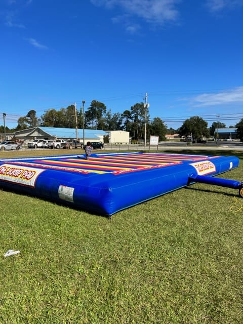 Our 25 foot by 40 foot inflatable trampoline is the ultimate addition to any backyard or event. With its vibrant colors and sturdy construction, the Jump Pad guarantees hours of endless fun for children and adults alike.