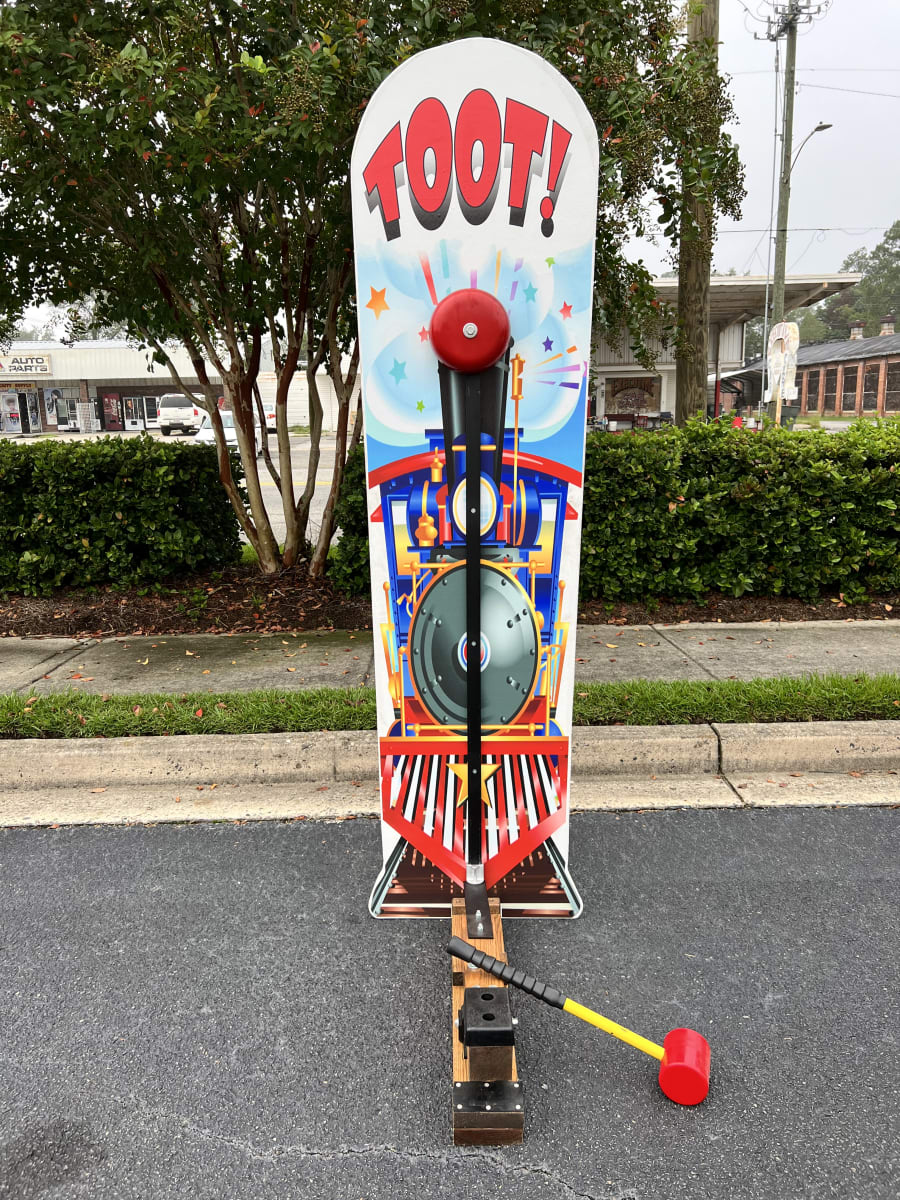 Kiddie striker is the perfect addition to any festival, carnival or group event. The background can be changed to feature a Snowman, Pumpkin, or Traindepending on your theme. Participant swings striker with all their might in an attempt to ring the bell.