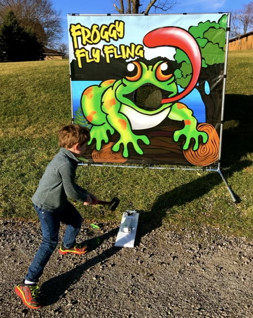 Hit the launcher with the hammer to try and launch the bugs into the frogs mouth.