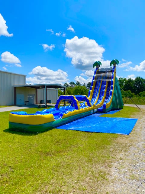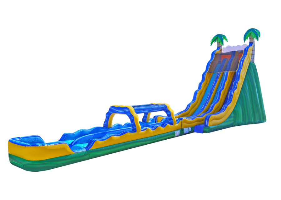 The 30' Tropical Wave dual lane water slide is a MONSTER, one of the biggest and baddest around!! It is perfect for your backyard party, school event, graduation, church gathering, and all other parties or gatherings. It is perfect for all ages (even adults love this one) It's attached slip n slide adds that extra bit of fun you've been looking for. It will make the perfect addition to your next event!